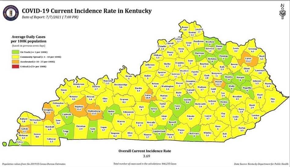 The Pennyrile District Health Department reports 32 new cases of the virus have been confirmed since last Friday in Livingston County. All the cases are recovering at home and range in age from 1 to 79. The increase of COVID-19 cases has pushed the county into the accelerated or orange group on the state’s incidence rate map of average daily cases per 100,000 population.