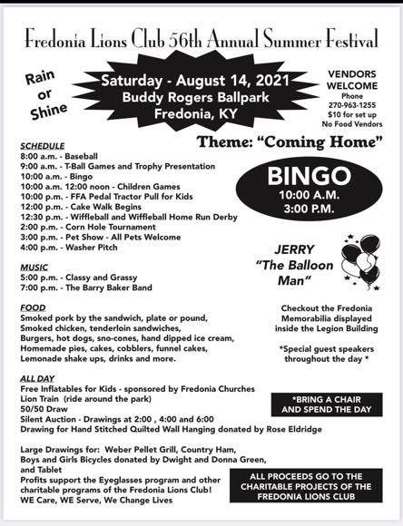 “Coming Home” is the theme of the Fredonia Lions Club’s 56th Annual Summer Festival that features a parade Friday and a full day of events Saturday at Buddy Rogers Ballpark.