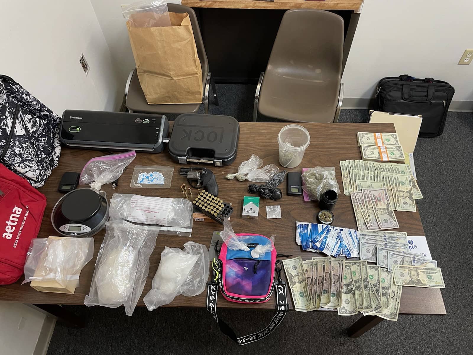 41-year-old Micah Gray was taken into custody and charged with trafficking marijuana over eight ounces but under five pounds firearm enhanced, third-degree trafficking in a controlled substance firearm enhanced, possession of synthetic drugs and drug paraphernalia, and three counts of trafficking meth over two grams second or greater offense.