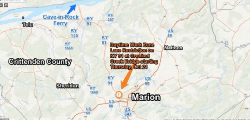 District 1 spokesman Keith Todd says the daytime work zone lane restriction at KY 91 is to allow initial prep work for the construction of a roadway diversion for the future construction of a new Crooked Creek Bridge. He says the work zone is along KY 91 at the Marion City Limits just over 1/2 mile north of the U.S. 60/Main Street intersection.