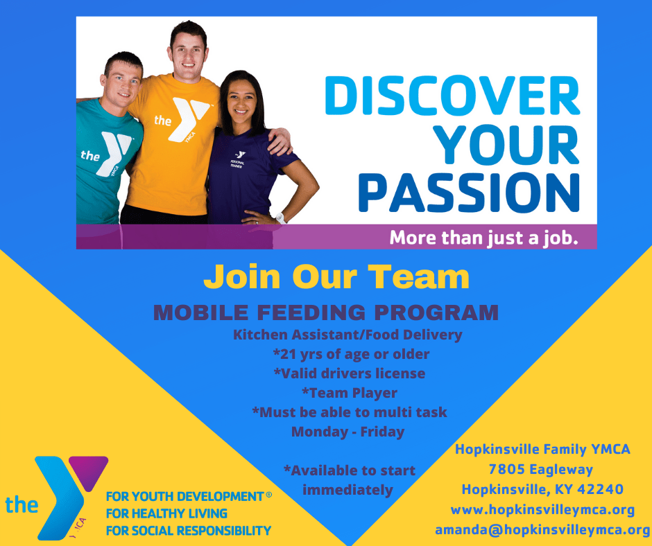 The Hopkinsville Family YMCA is looking for someone to fill a position in Mobile Food Program Kitchen Assistant and Program Food Delivery.