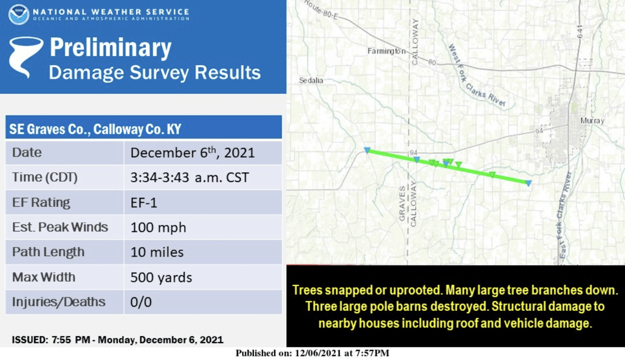According to the storm survey the tornado began in Graves County southeast of Sedalia and Farmington at 3:34 am. The tornado had peak winds of 100 miles per hour and was on the ground for 9 minutes covering a path of 10 miles.