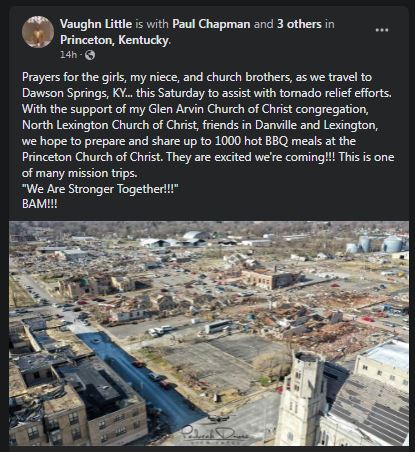Vaughn Little, a senior principal at the Jefferson County Public Schools and greater Lexington area, announced through social media he’s bringing his girls, his niece, some friends from Danville and his church brothers from the North Lexington Church of Christ and Glen Arvin Church of Christ to assist with relief efforts.