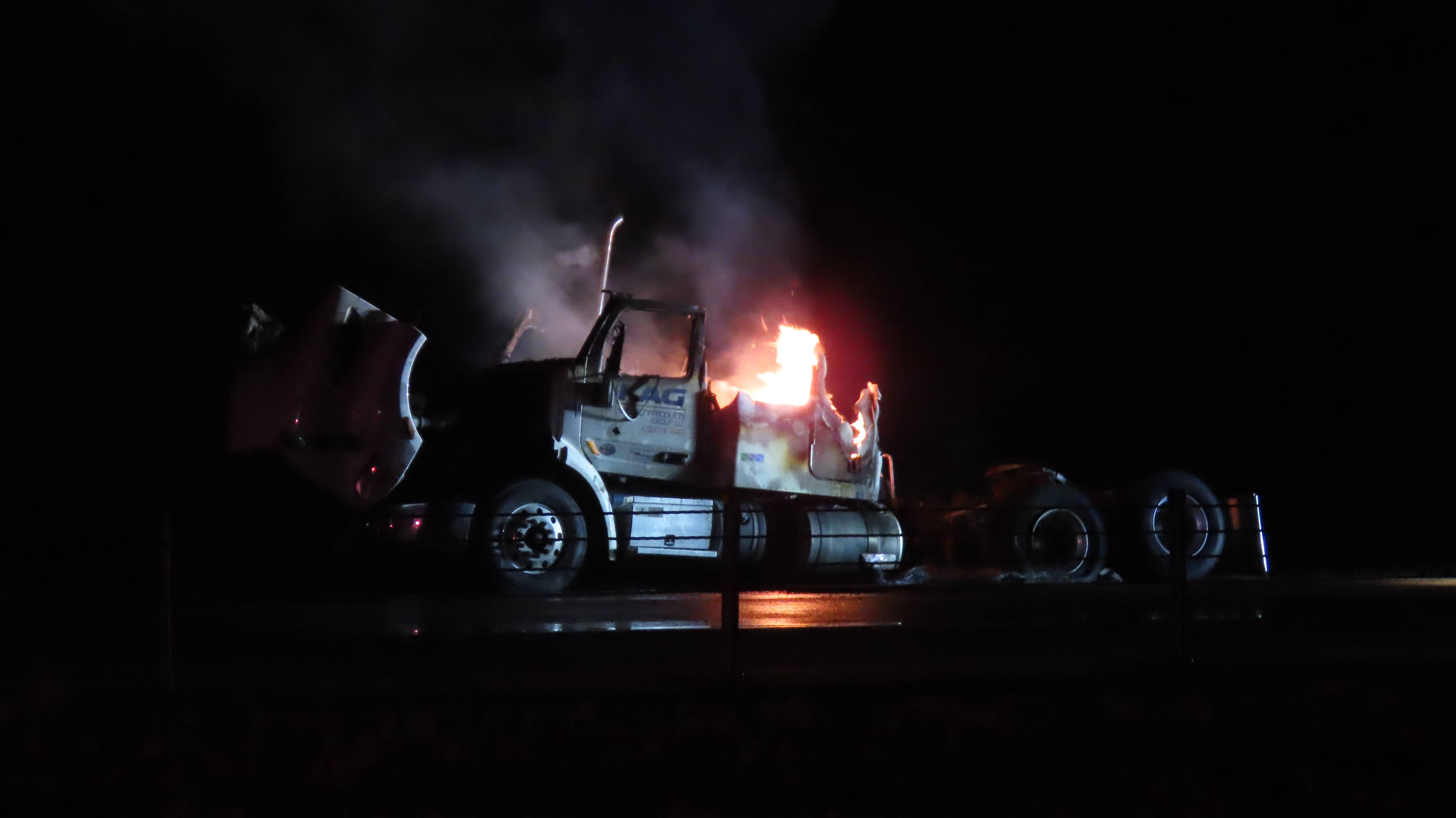 A tractor-trailer fire on Interstate 24 at the 74-mile-marker led to the westbound lanes of the interstate being blocked Tuesday night.