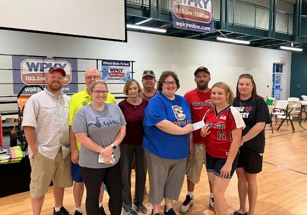 Optimist Club members Benji Kilgore, George Kilgore, Kasey Miranda, Joyce Farmer, Zeke Jamison and Jo Ann Coomer presented the donation to Smash House representatives Michael Minton, Sarah Baker and Amber Minton.