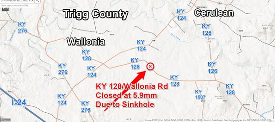 Kentucky 128 is closed near mile point 5.9, where a sinkhole has developed in the middle of the road. This is between Barefield Road and the Cerulean Road intersection.