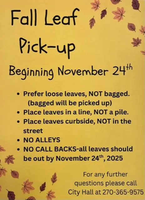 Residential leaf pick up begins November 24th, 2025 in the city of Princeton, Ky. Crews prefer loose leaves, not bagged, raked into a line along the curb for easy pick-up. For more information, please call Princeton City Hall at 270-365-9575.