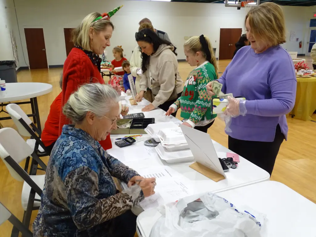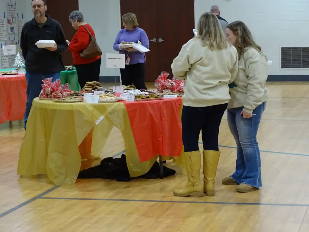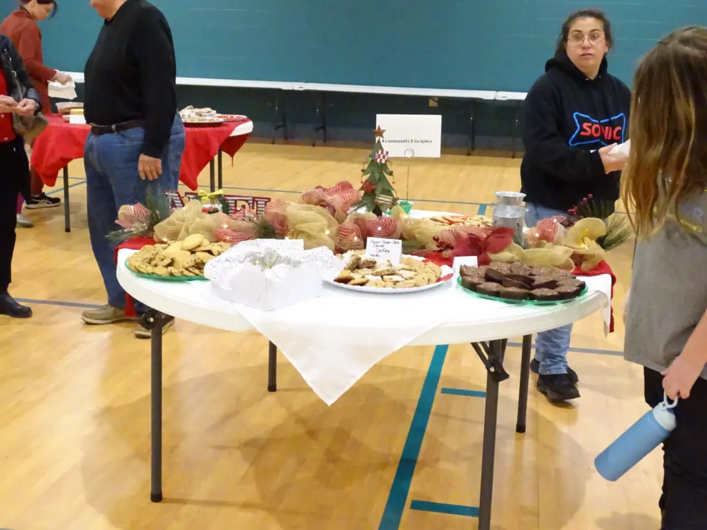 click to download audioTables were set up in the Community Life Center at First Baptist Church, where attendees picked up a box and went around to each table to select their favorite homemade cookies, which were sold at $6 per pound.