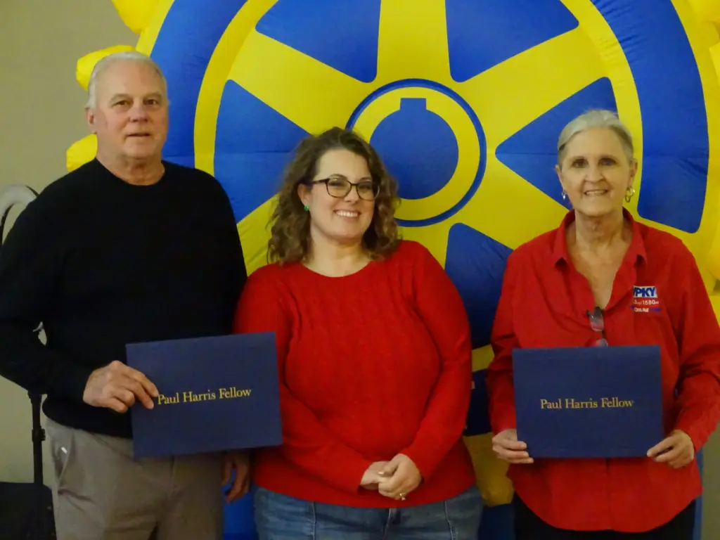 Additionally, Burton presented two Paul Harris Fellow certificates and pins at the party, explaining that this is Rotary International’s highest recognition.