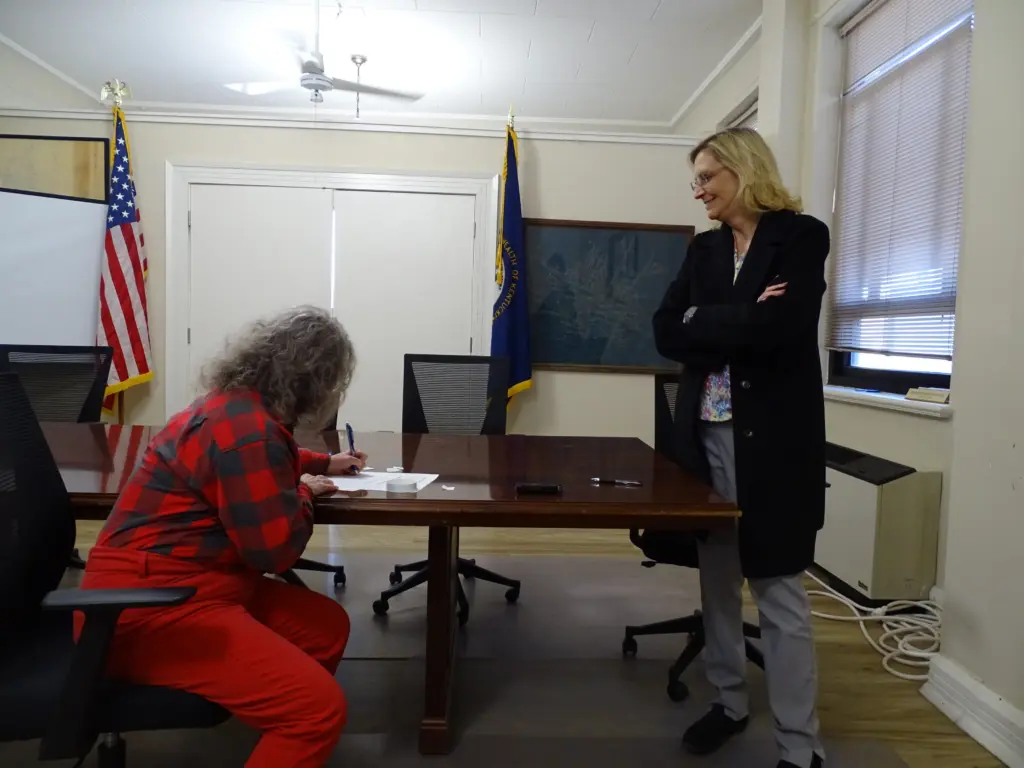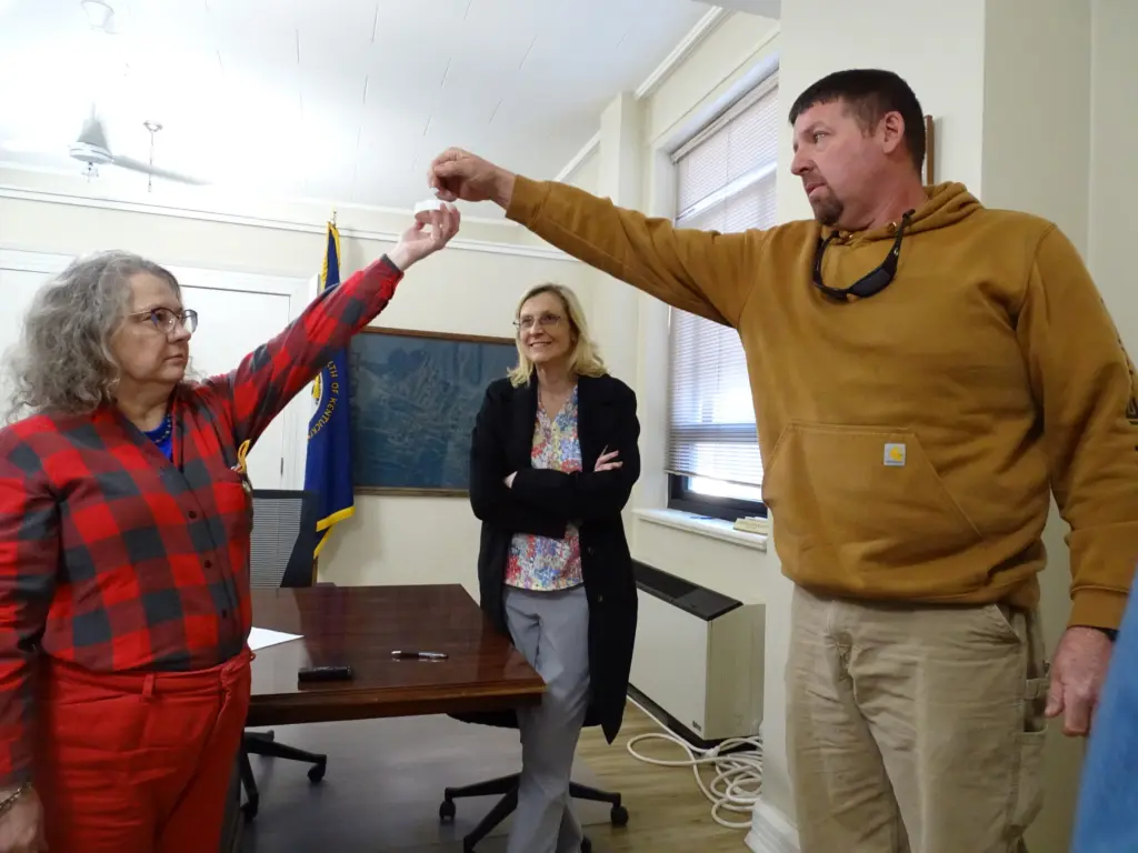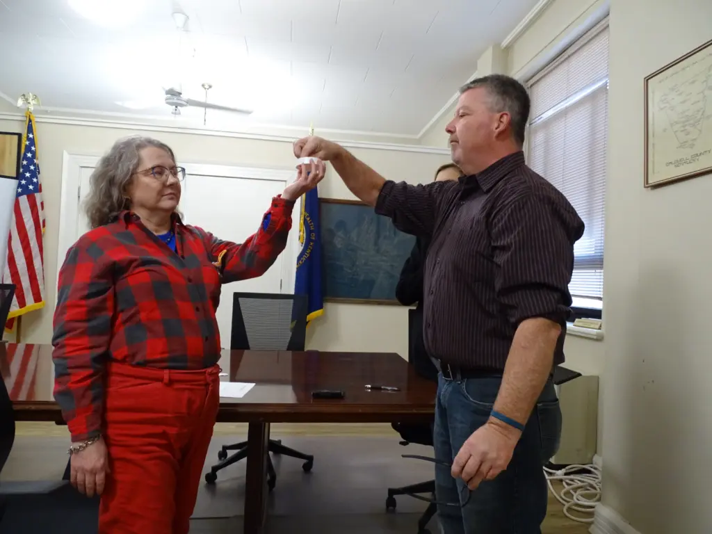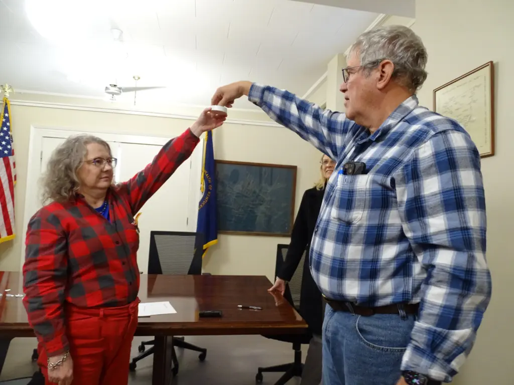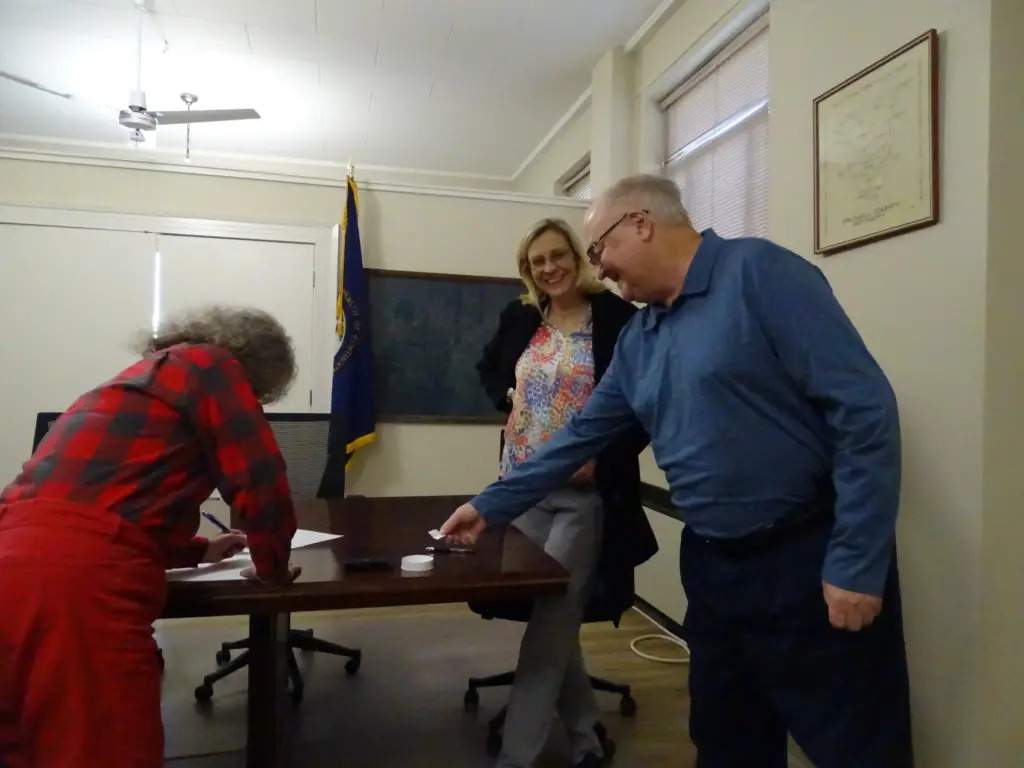 County Clerk Jennifer Hale called each candidate forward, while Deputy Clerk Beverly Hughes held the cup from which they drew their numbers.