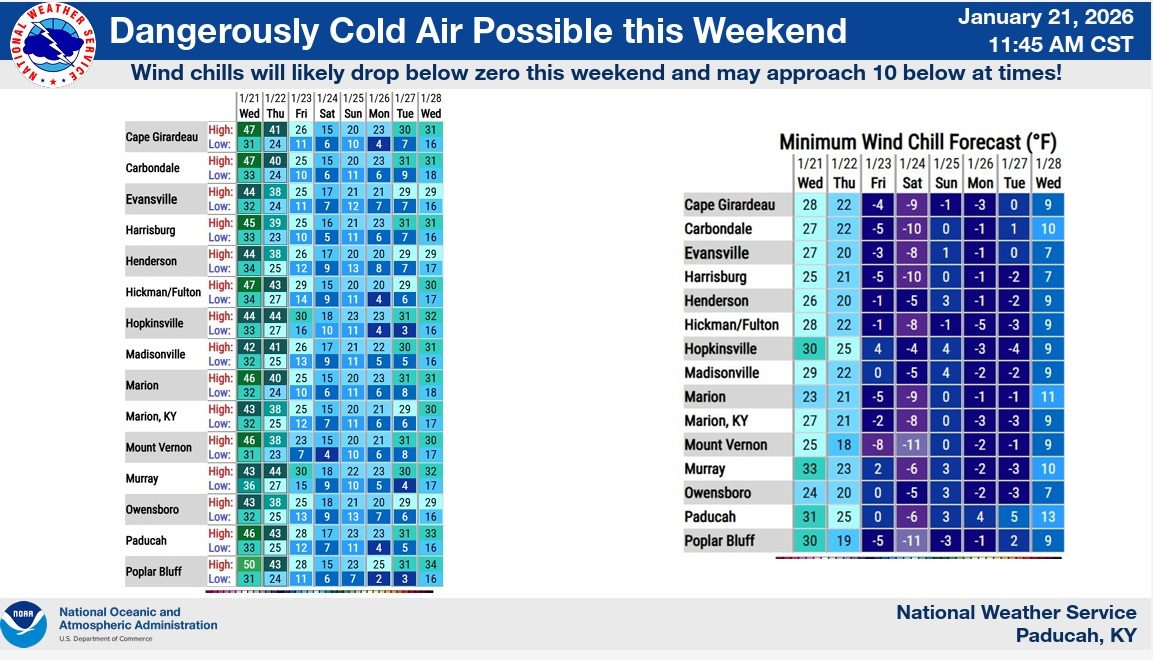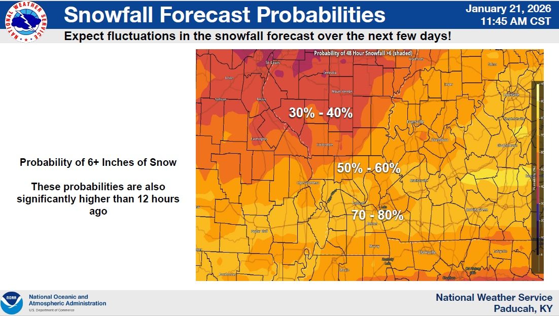 Justin Gibbs, a lead forecaster for the weather service, says the snow should begin Friday night, with the southern Pennyrile possibly to see some freezing rain as well.