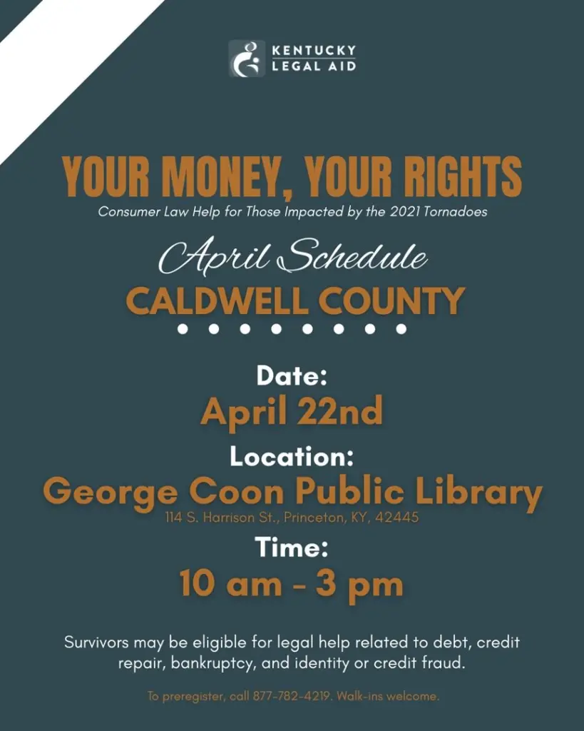 More than four years after the devastating December 2021 tornadoes, many Western Kentucky residents continue to face long-term financial and legal hurdles. To assist with the ongoing recovery, Kentucky Legal Aid is hosting a series of free clinics across 15 impacted counties, including Caldwell, to provide survivors with professional guidance.