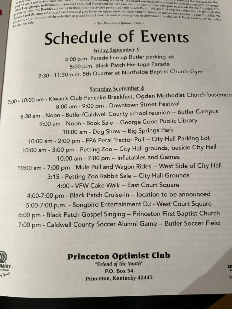 click to download audioThere will also be a lot of regular favorites during the Festival. The Princeton Kiwanis Club will kick off the morning with their famous pancake breakfast held in the basement of Ogden Church on Main Street. The Butler/Caldwell County Reunion at the Butler Campus, Dog Show at Big Springs Park, D.J. music from 5-7 on West Court Square, Gospel Singing at First Baptist, and Alumni Soccer Game at Butler Field. Lots of free activities for children, including bouncy houses, bubbles, and games on Main Street. The Petting Zoo and Petal Tractors, and 4-H activities at City Hall.