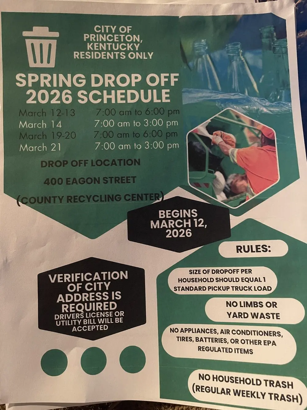 The drop off location is at the county Recycling Center, located at 400 Eagon Street. Residents must provide verification of a city address, such as a driver’s license or utility bill.