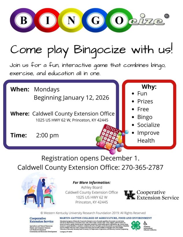 Caldwell County Extension Office 1025 US Highway 62 W, Princeton, KyBingocize is BACK in 2026 starting Mondays in January! To register or for more information, call our office at 270-365-2787.