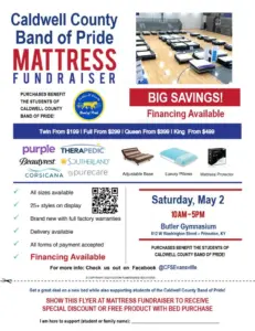 Mark your calendars! The Caldwell County Band of Pride‘s annual mattress fundraiser sale will return Saturday, May 2nd, from 10am to 5pm at Butler Gymnasium in downtown Princeton! HUGE discounts on name brand mattresses, adjustable bed bases, luxury pillows and more. Caldwell County Schools employees and local heroes (Police, Fire, EMT, Military, Veterans, etc.) receive a special 10% discount as well! Bring a copy of the attached flyer for additional discounts! Every sale benefits the Caldwell County Band program.