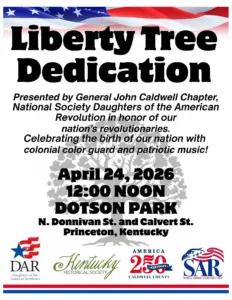 Everyone is encouraged and invited to attend history in the making! The Caldwell County Liberty Tree Dedication will be held at our historic Dotson Park in Princeton, Friday April 24th at Noon. The General John Caldwell Chapter, National Society Daughters of the American Revolution will present the dedication in honor of our nation’s revolutionaries alongside sponsors:  Caldwell County Fiscal Court, Kentucky Division of Forestry, Dotson Park Board and the City of Princeton. Celebrate the birth of our nation with Captain William Prince, Sons of the American Revolution’s Colonial Color Guard with the posting of colors, patriotic music from our very own Caldwell County band of Pride, special guest speakers and more!