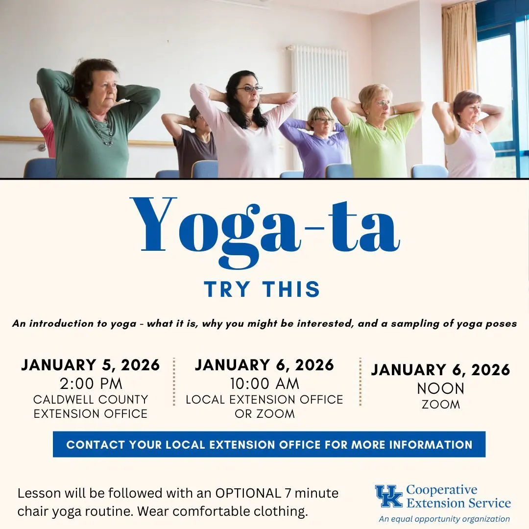 The Caldwell Extension Office is bringing in the new year with fun, healthy new options! Yoga-ta Try This! January 5 at 2 pm at the Caldwell County Extension Office. Check flyer below for additional times and days including zoom options! No pre-registration required.