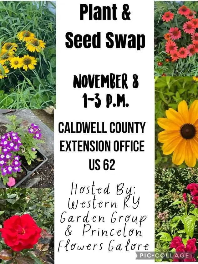 Join Western Ky Garden Group and Princeton Flowers Galore at the Caldwell County Extension Office for a “Plant and Seed Swap” Saturday, November 8th, from 1-3pm.  Any type or variety of seeds welcome: usually flower, vegetable, fruit, or tree. Some vendors bring flowers, shrubs, trees, and succulents.  Swap, buy or sell. Everyone is invited to visit, participate or both!  Caldwell Co Extension Office is located on Hwy 62 West, in Princeton Ky.