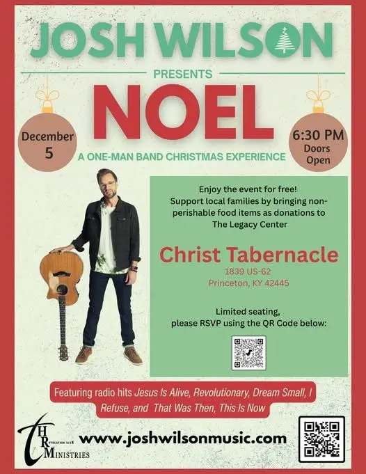 Don't miss the HR Ministries winter concert at Christ Tabernacle in Princeton. Friday, December 5th, Josh Wilson presents "NOEL", a "one-man band Christmas experience". (Featuring radio hits including Jesus is Alive, Revolutionary, Dream Small, I Refuse, and