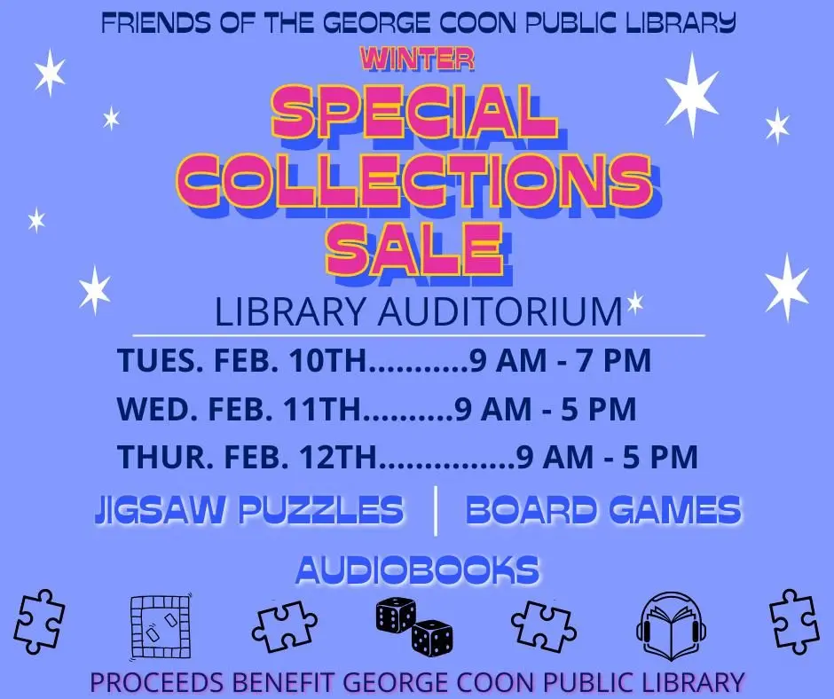 Friends of the Library are having their Winter Special Collections Sale again. Jigsaw puzzles, board games and audio books for amazing prices. Tuesday Feb 10th - 9am-7pm Wednesday, Feb 11th- 9am-5pm Thursday, Feb 12th - 9am-5pm